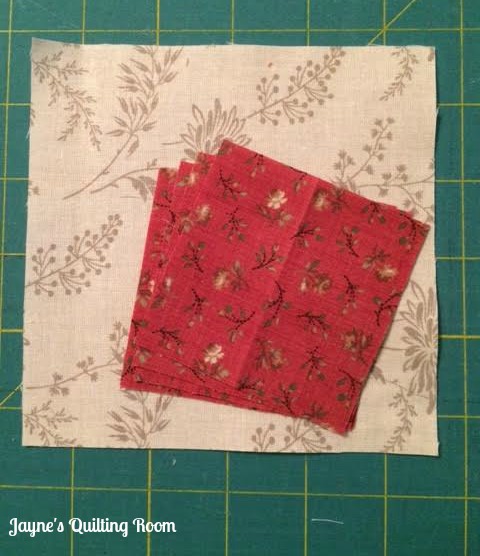 Above is all the necessary fabric to make 4 complete flying geese units -- one large square for the background and 4 small squares for the points. There are formulas and charts available by searching the interwebs that give you specific sizes. Of course, my pattern directions provided me with the measurements required for this quilt.